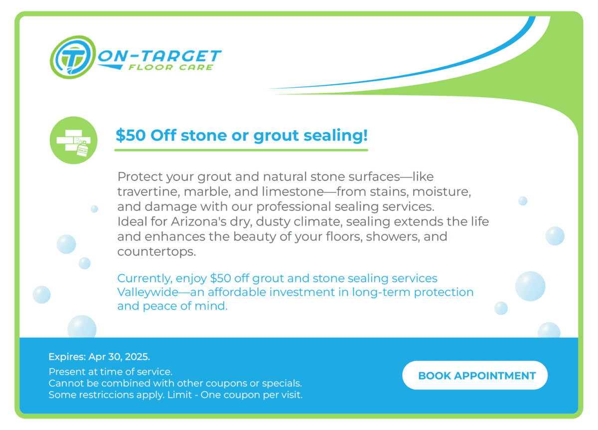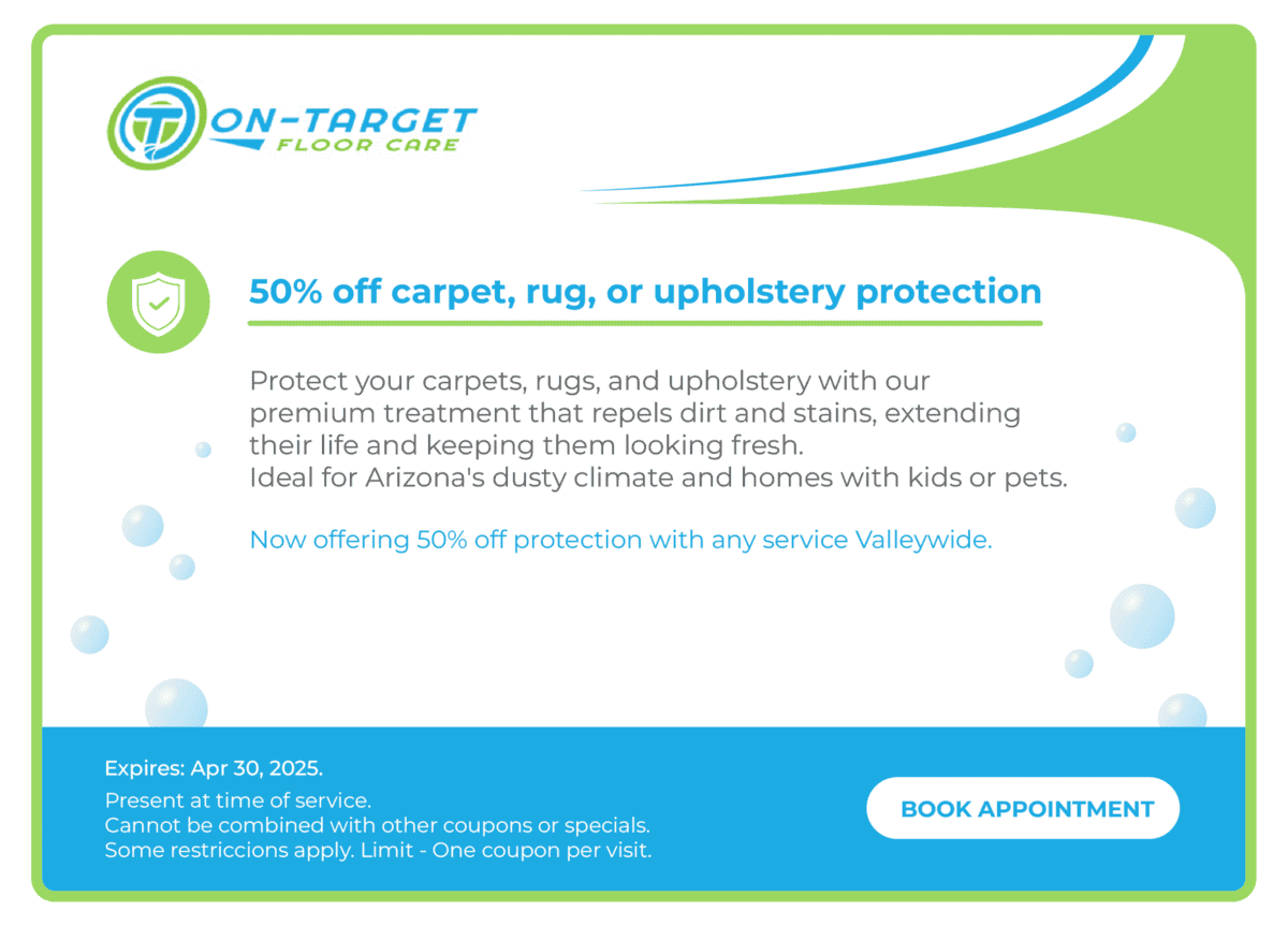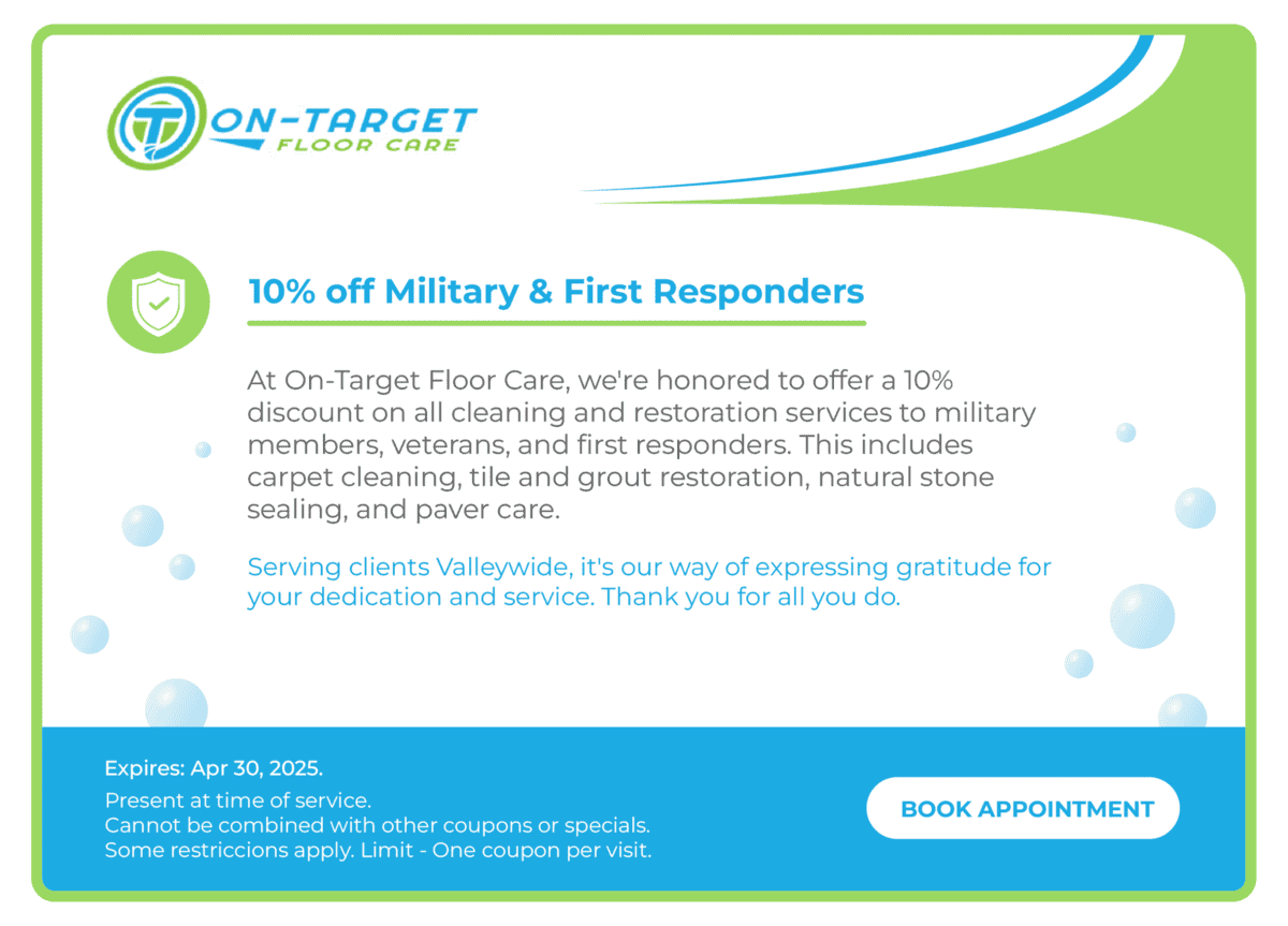 Protect your surfaces. Save money. Ask about our carpet & upholstery protection specials, military & first responder discounts, and stone & grout sealing offers.